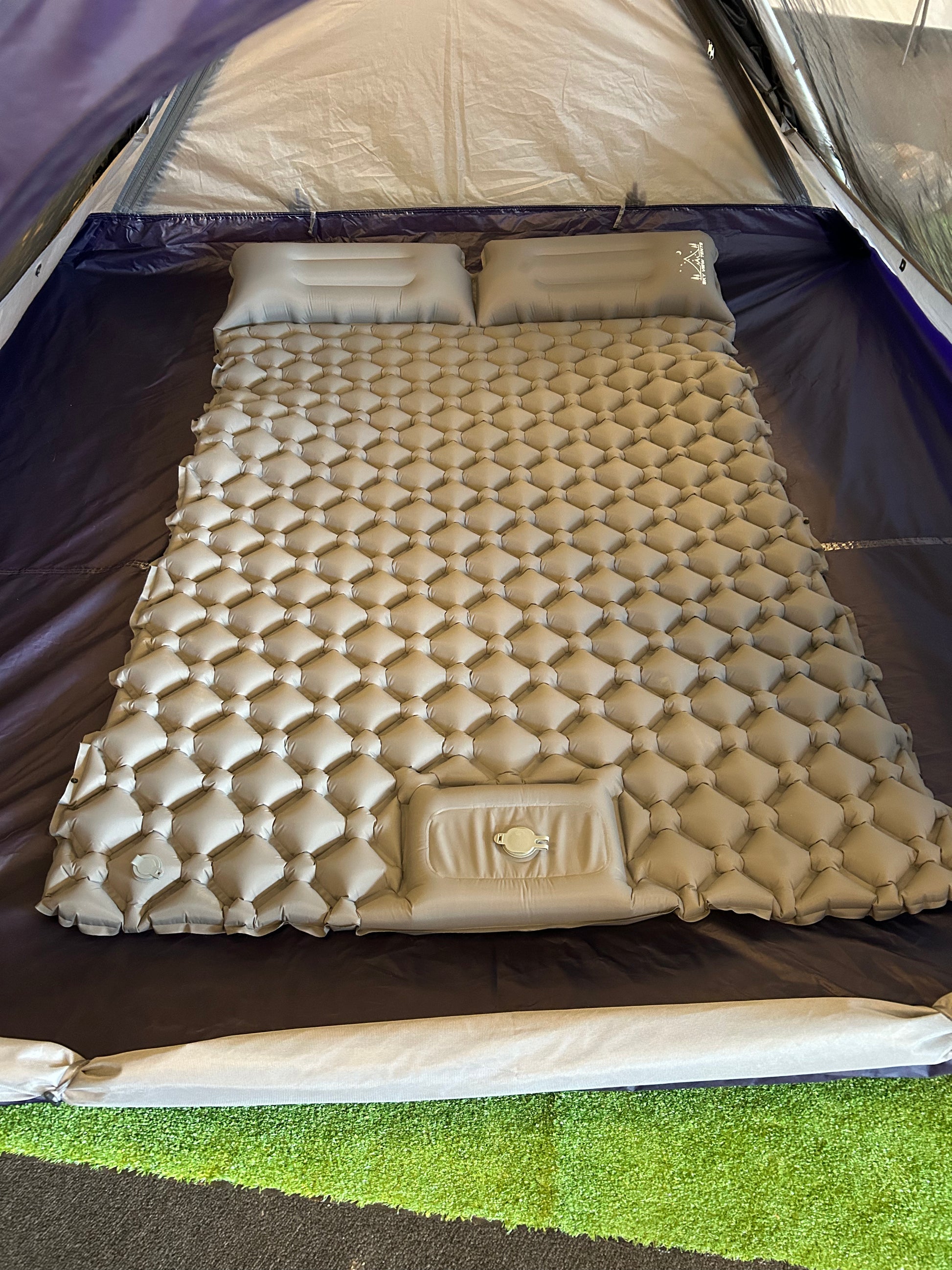 Description: What stargazing tent would be complete without a large 2-person air mattress featuring built in pillows? Our mattress pad features a built-in foot pump, making it easy to inflate anywhere. Optionally inflate with a pump or by mouth with an additional convenient inflation port. We find the built-in pillows are actually just the right size and very comfortable. Never forget your pillows again!